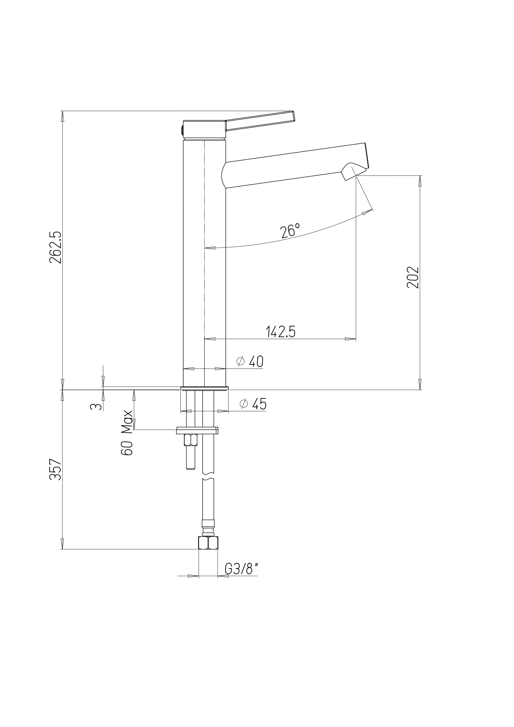 Hauteur totale : 262 mm Hauteur sous bec : 202 mm Saillie du bec : 142 mm Livré sans vidage Ø de perçage : 35 mm