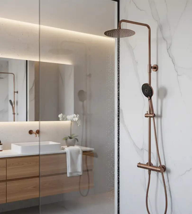 Le Colonne de douche thermostatique 3 jets Ortence PVD bronze cuivré présente de nombreux avantages. Il offre un grand confort en maintenant une température d’eau stable, évitant